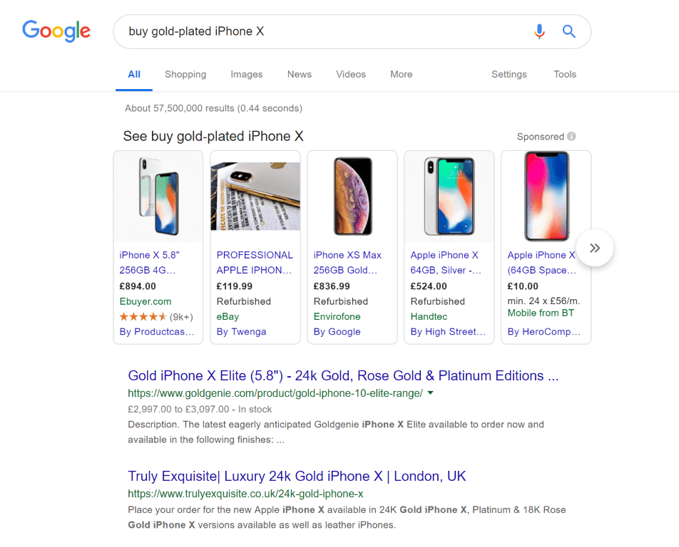 Намерението за търсене е важна част от проучването на ключови думи, защото ви позволява да планирате съдържанието си по такъв начин, че то да отговаря на нуждите на потребителите. Ако се върнем към предишния пример, нашият търсач "купувам позлатен iPhone X" най-вероятно не иска да чете блог публикация в този момент! Той иска да бъде насочен към продуктова страница, която включва всичко, което трябва да знае за покупката, включително цени, спецификации и информация за доставката.